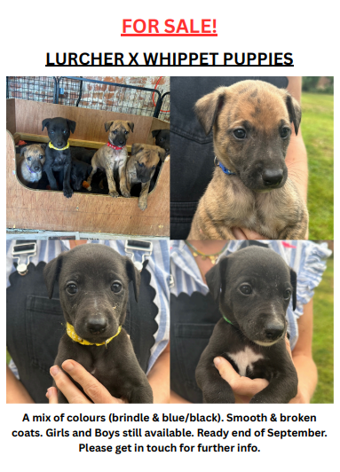 Gorgeous lurcher x whippet puppies for sale. A mixture of brindle/ blue/black, smooth and rough coated. Boys and girls available.