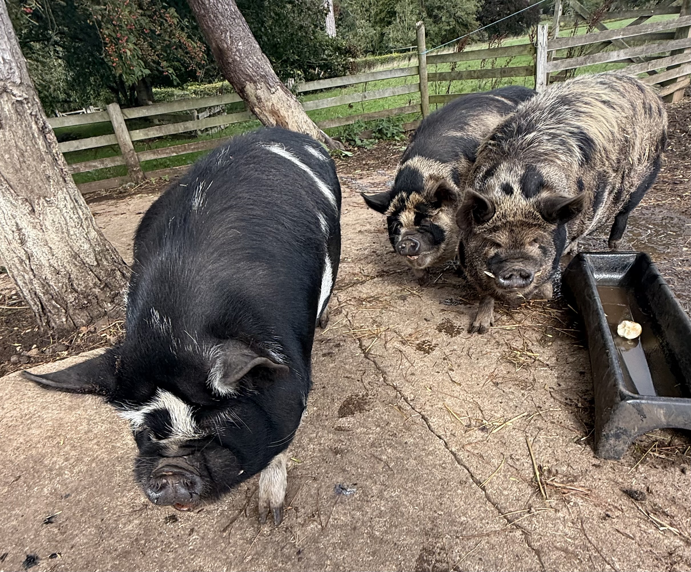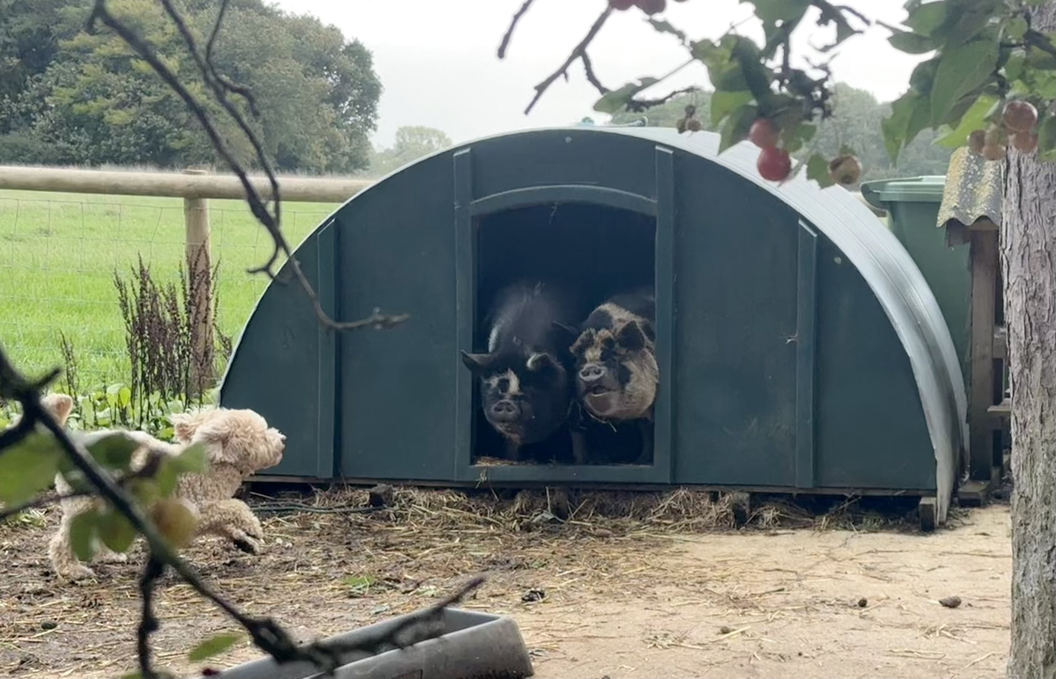 Due to relocation we have to re-home our heavenly pigs: London is apparently not ideal for pig husbandry. They are brilliant at clearing woods, paddocks etc. and get on with all and every animal as such calm temperament. They come running when you call them: utter heaven. 2 boys (castrated) & 1 girl. they need shelter (ark free too if you need), pig nuts, straw and water. super easy.