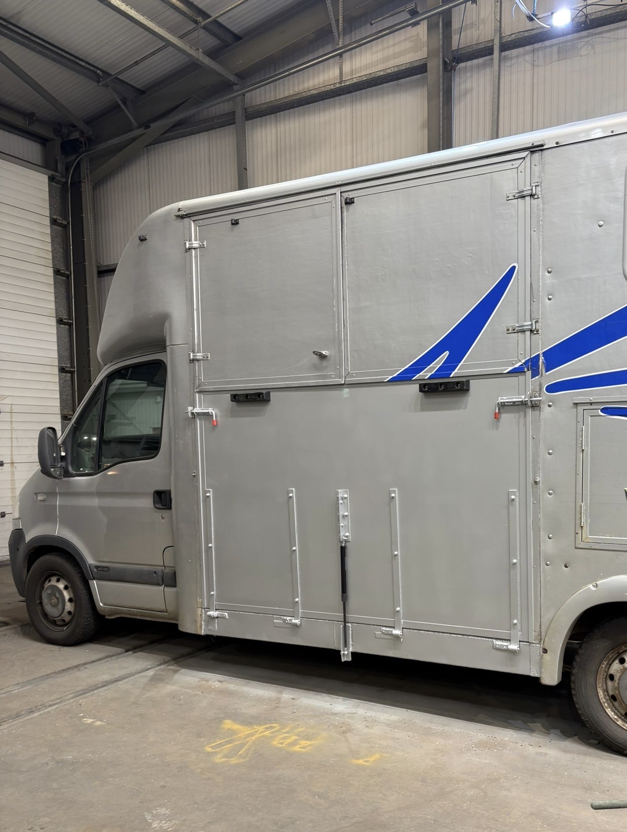Stalled for 2, high breast bar, Luton area with door for rugs etc, light in horse area, back external door with additional jockey door into horse area, aluminium floor with removable rubber mats