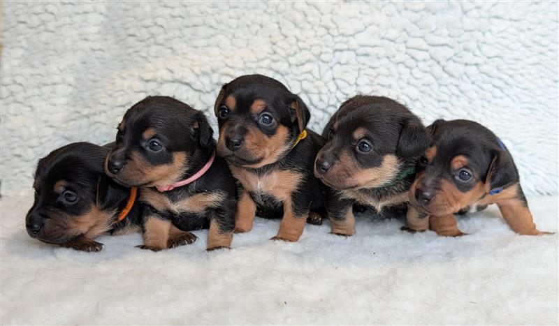 Freda has had a litter of 4 puppies and 1 Bitch is still looking for her forever home, they are 6 weeks old at the moment, full of character, well socialised and huge time wasters, they are Teckle society registered, wormed, vet checked and microchipped. The puppies will be ready to leave any time after the 19 September. Photo of Freda (Mum) Dougal (dad) and pup.